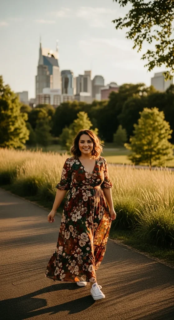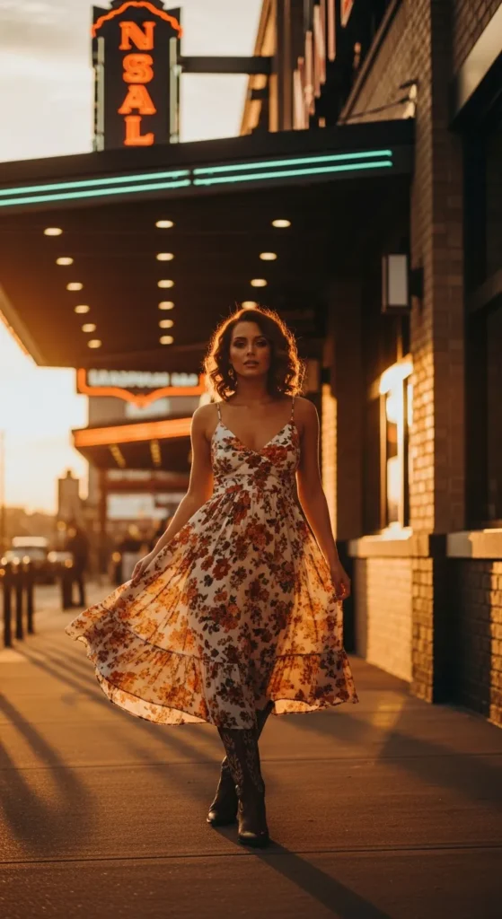 A soft, flowy sundress paired with classic western boots captures the essence of Nashville style, feminine with a bold twist. It’s the kind of outfit that moves beautifully in the warm breeze.