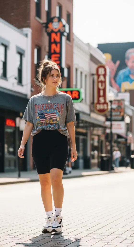 An oversized tee paired with biker shorts gives that effortless, off-duty vibe. It’s comfortable, practical, and perfect for daytime exploring.