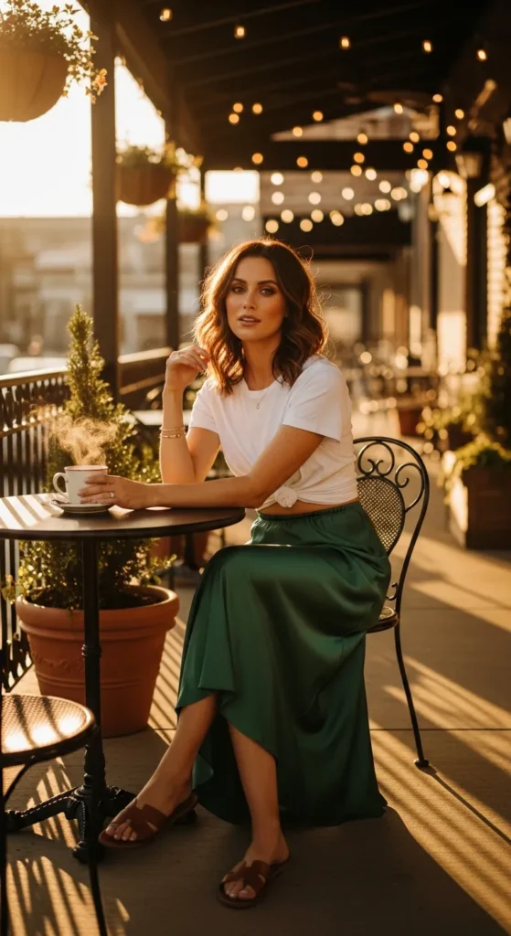A satin slip skirt paired with a simple tee creates a soft contrast between casual and elegant. It’s understated but undeniably stylish.