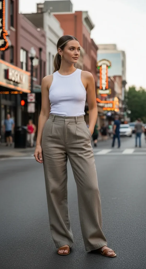 A fitted tank with wide-leg pants creates a balanced silhouette that feels both modern and breathable. It’s ideal for staying cool while looking polished.