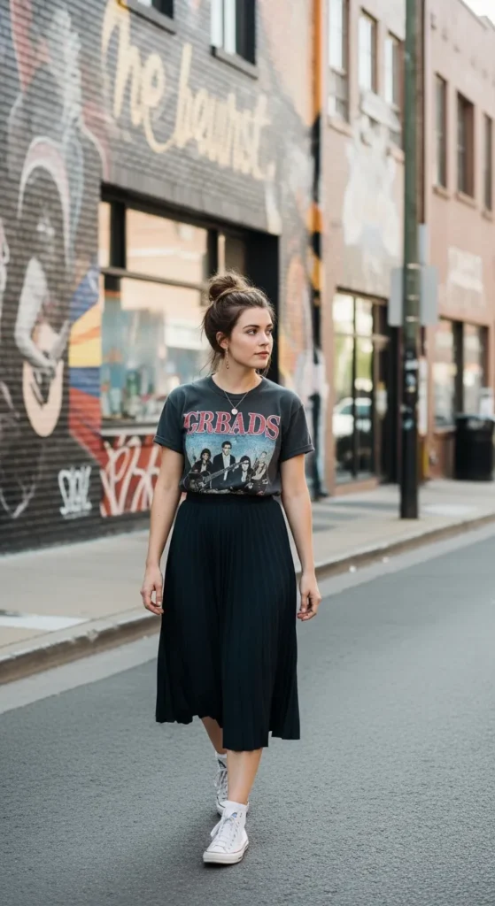 A vintage-inspired tee tucked into a pleated skirt creates a playful, nostalgic look that feels fresh and wearable.