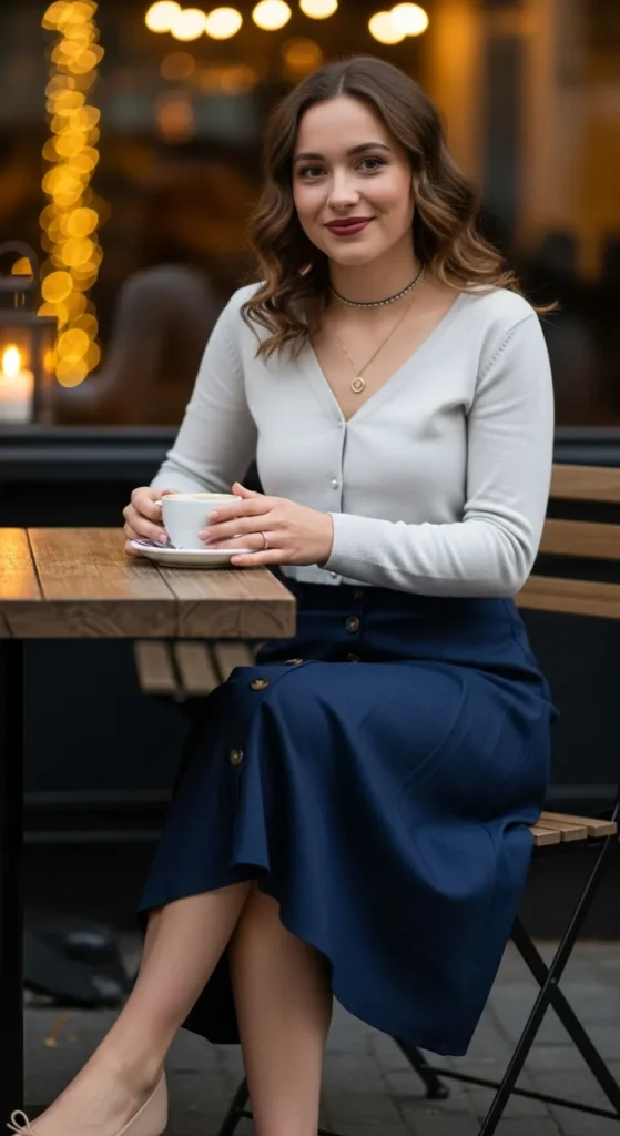 A navy button-front midi skirt paired with a light cropped cardigan creates a polished yet cozy summer outfit perfect for breezy evenings.