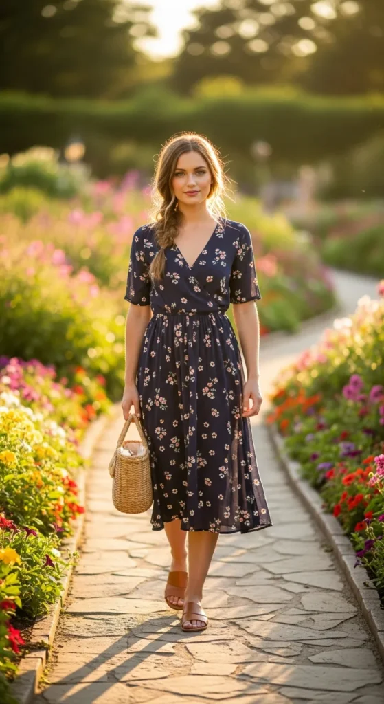 A navy floral midi dress brings soft romance into summer style. The dark base makes the florals pop while still feeling classic and easy to wear.