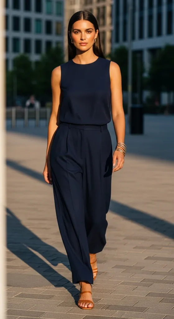 Flowy navy wide-leg trousers paired with a crisp cropped white tank create the perfect balance between structured and relaxed. The look feels modern, airy, and incredibly comfortable for warm summer days.