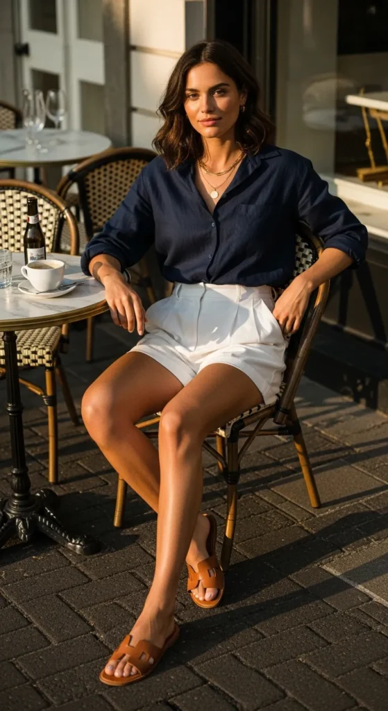A navy linen button-down instantly brings that effortless summer elegance. Paired with crisp white tailored shorts, the look feels fresh, breathable, and polished, perfect for brunch dates, seaside strolls, or a relaxed afternoon in the city.
