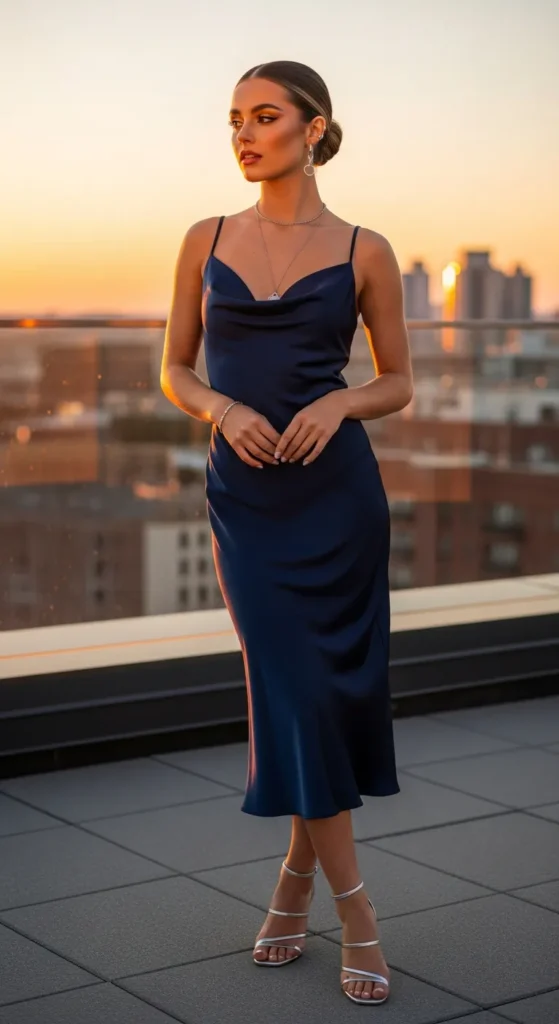 A navy satin midi slip dress moves beautifully with every step. The smooth texture paired with minimal strappy sandals creates a sleek summer look that feels effortless yet quietly sophisticated for dinner or evening outings.