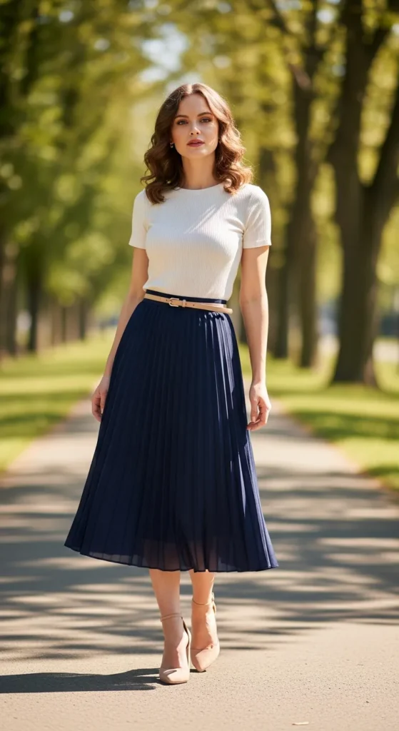 A navy pleated midi skirt instantly adds graceful movement to an outfit. Paired with a fitted ribbed tee, the look feels balanced, feminine, and perfect for casual summer gatherings.