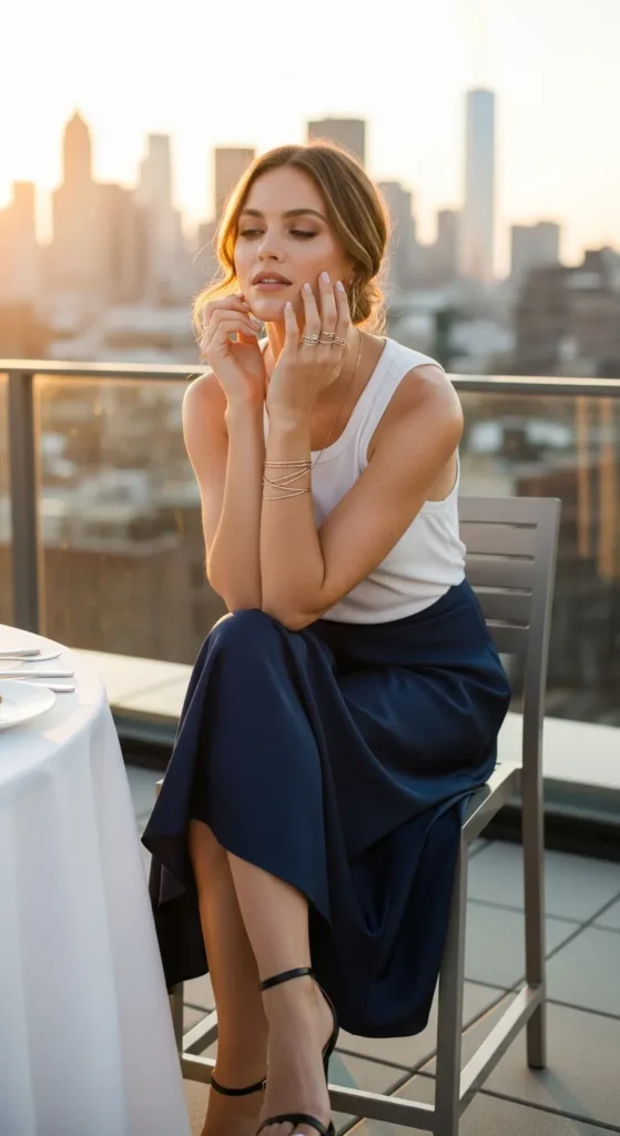 A navy satin skirt paired with a simple tank top creates a soft contrast between texture and simplicity. It’s an elegant outfit that works beautifully for summer evenings.