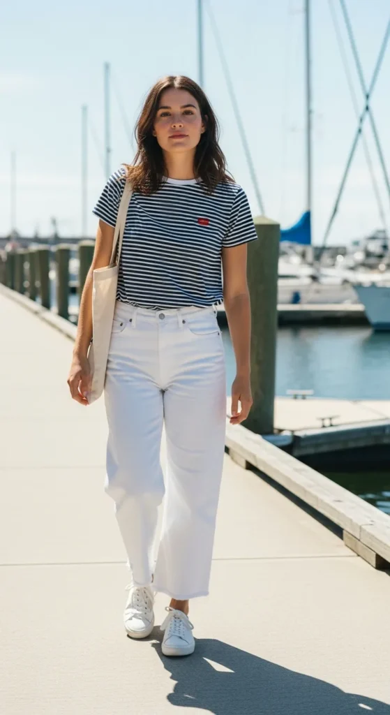 Stylist Suggestion: Wear classic white sneakers and a canvas tote. These casual elements reinforce the relaxed maritime aesthetic.