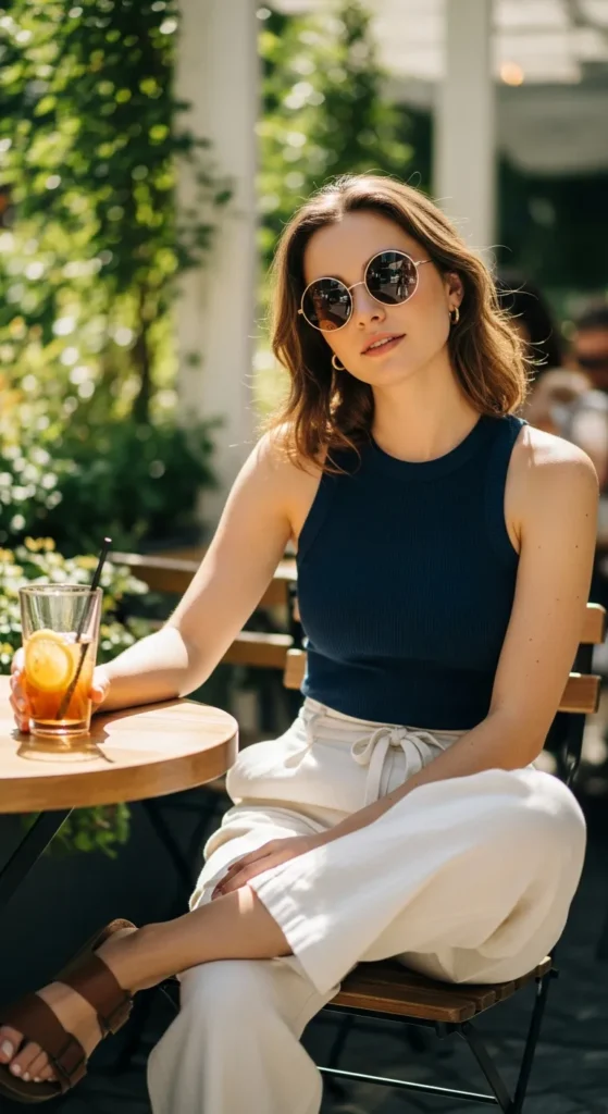 A simple navy tank top tucked into cream linen pants creates a breezy summer combination that feels both minimal and sophisticated.