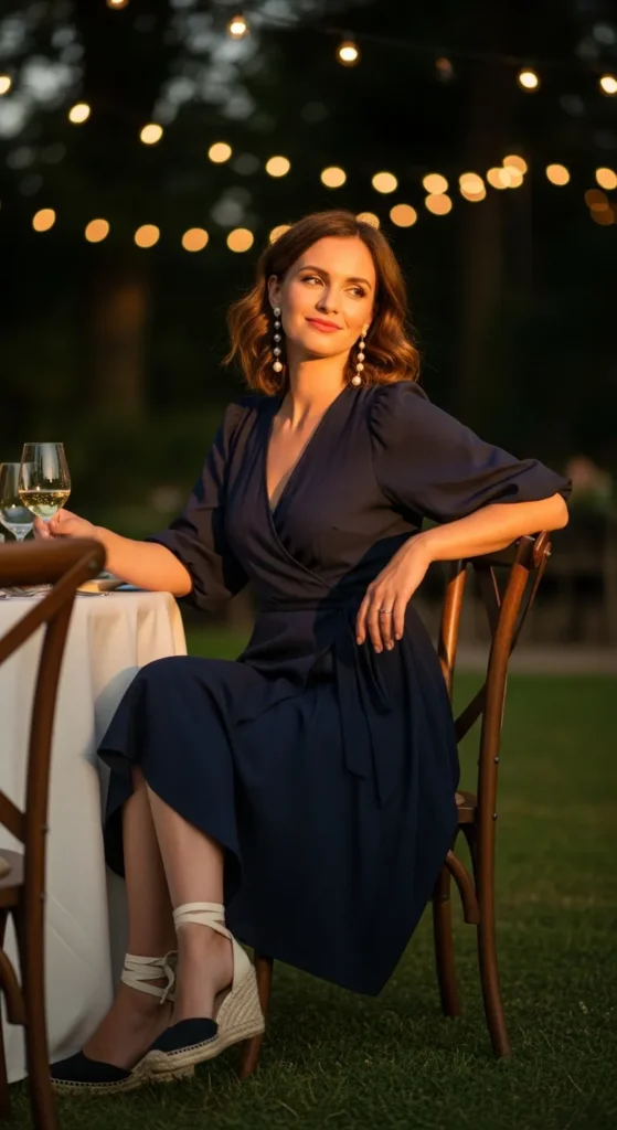 A navy wrap dress flatters almost every body shape while feeling breezy and feminine. Paired with espadrille wedges, it becomes the perfect outfit for summer dinners or garden parties.