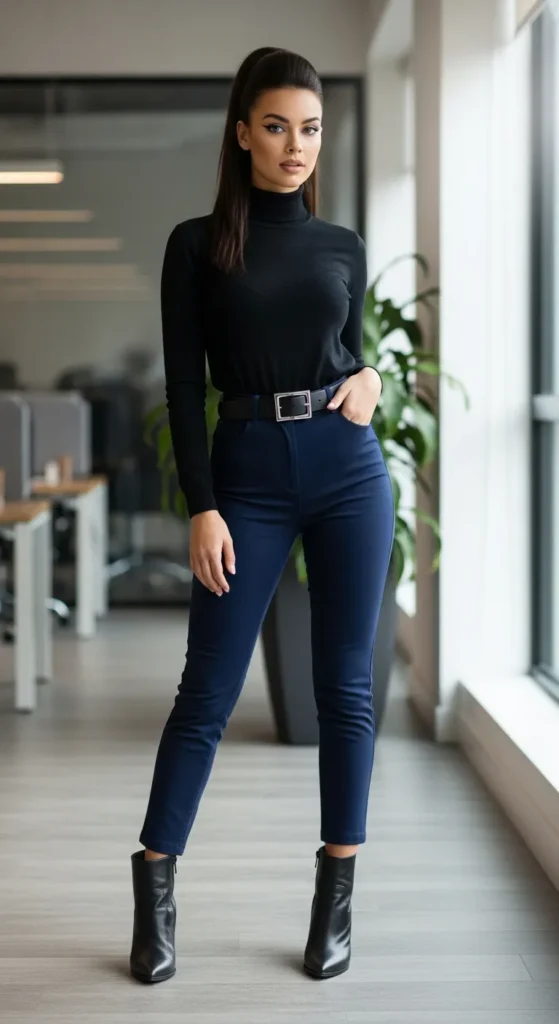A fitted black turtleneck with navy cigarette pants offers a sleek, modern silhouette perfect for client meetings or evening outings. The monochromatic contrast emphasizes clean lines and sophistication.