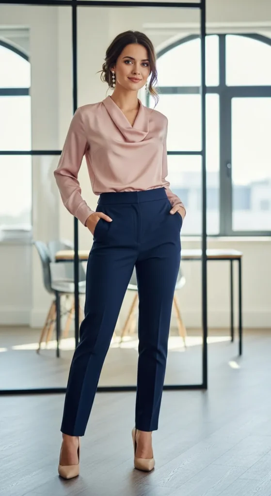 A blush pink blouse tucked into high-waisted navy trousers adds softness to structured tailoring. Perfect for office settings or lunch meetings, this mix balances professional polish with feminine warmth.