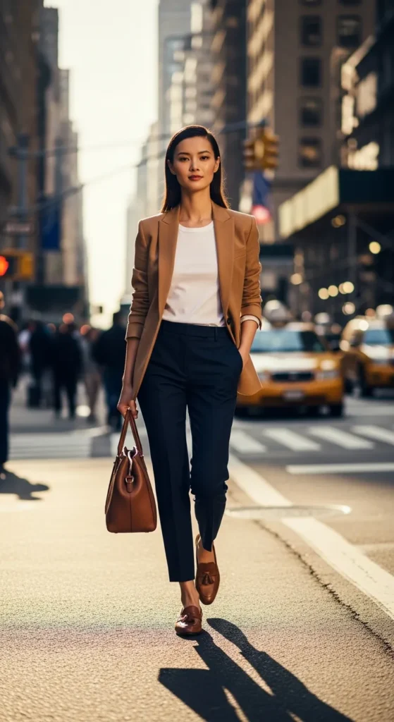 Pairing a camel blazer over a simple white tee and navy pants balances professional structure with casual ease. Perfect for presentations, coffee meetings, or smart casual gatherings.