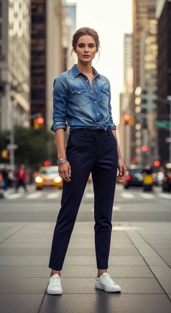 A chambray shirt tucked into navy pants is a modern take on smart casual. It’s versatile for office hours or weekend errands while maintaining a polished vibe.