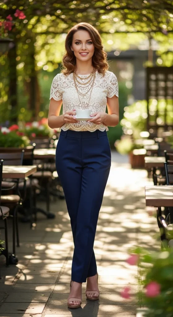 A delicate cream lace top tucked into navy trousers creates a romantic yet polished outfit suitable for brunches or daytime events. The textures contrast beautifully, adding interest without overwhelming the silhouette.