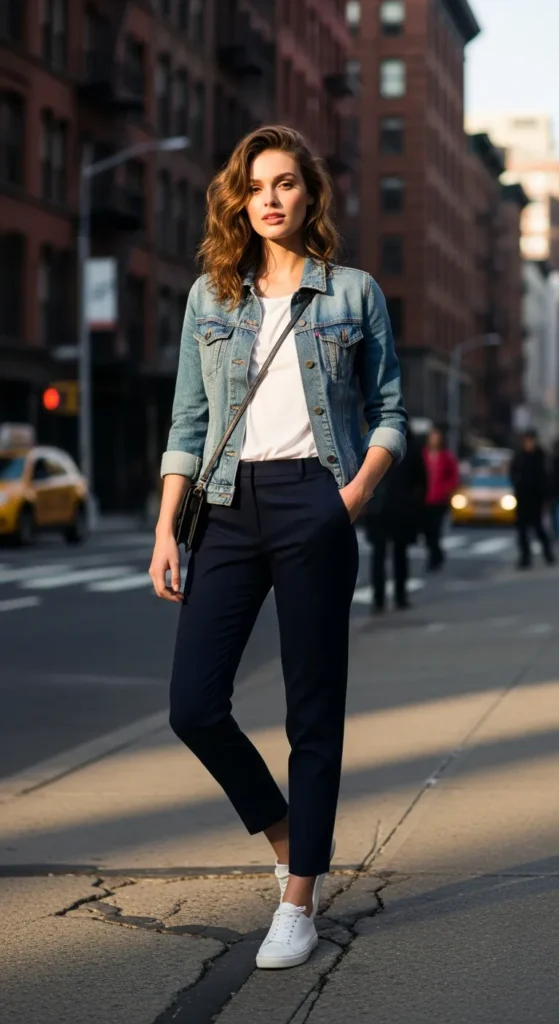 A fitted light denim jacket over a white tee and navy trousers balances casual and polished effortlessly. Perfect for city strolls or casual business-casual meetings.
