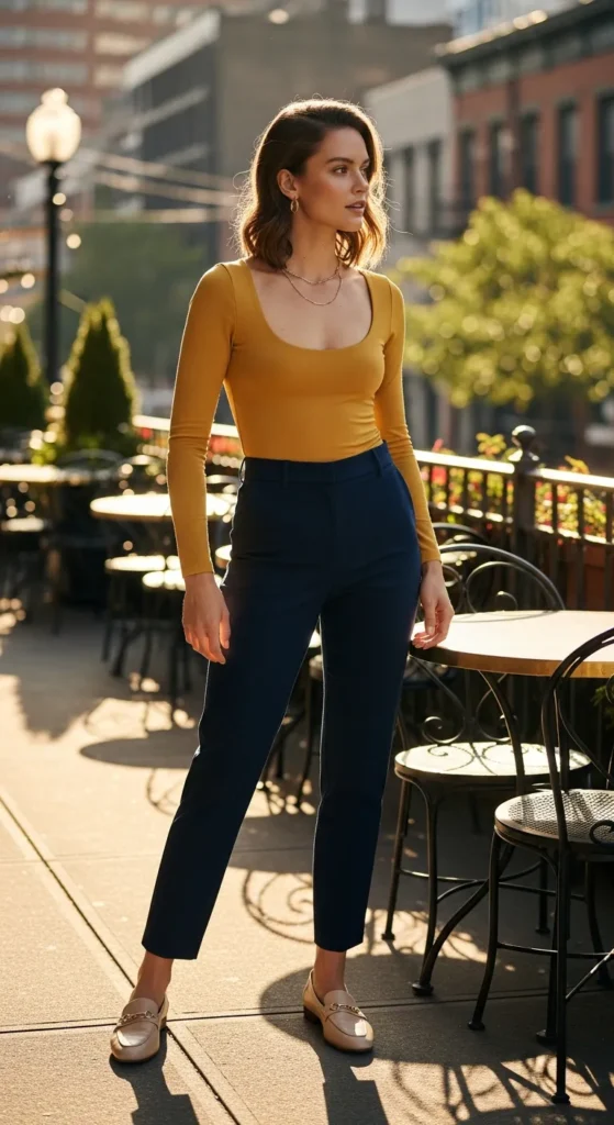 A mustard yellow top paired with navy pants adds vibrancy without compromising sophistication. Perfect for creative office environments or casual meetups.