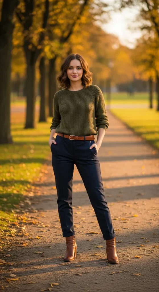 A muted olive green sweater paired with navy slacks creates a cozy yet structured outfit suitable for casual Fridays or creative workspaces. The color pairing is unexpected yet harmonious.