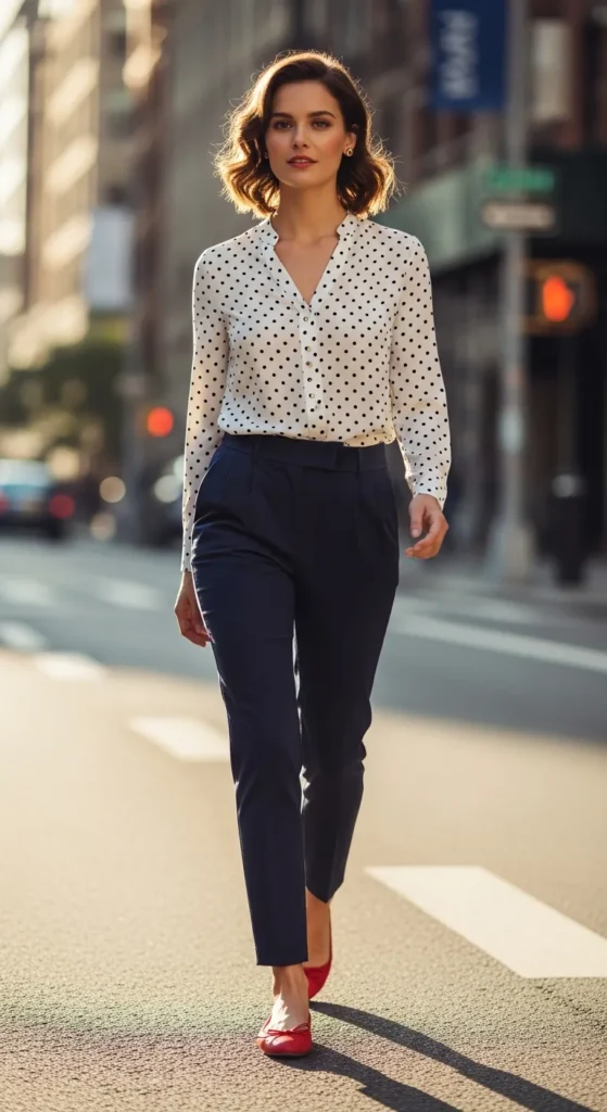 A playful polka dot blouse paired with navy pants transforms a classic base into a lively, yet polished outfit. Ideal for office parties or casual dates.