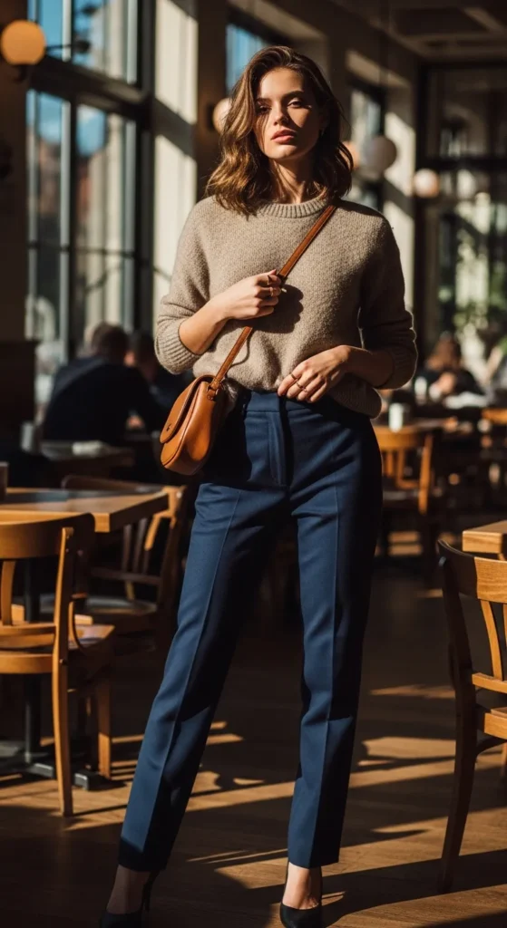 A cozy beige sweater tucked into navy pants blends warmth with structure. This combination is casual yet polished, ideal for weekend coffee dates or relaxed office vibes.