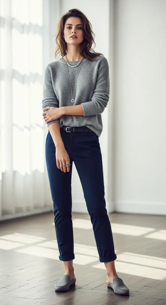 A lightweight gray knit tucked into navy chinos is effortlessly chic for creative workdays or relaxed weekends. The muted palette is calming yet sophisticated, perfect for understated elegance.