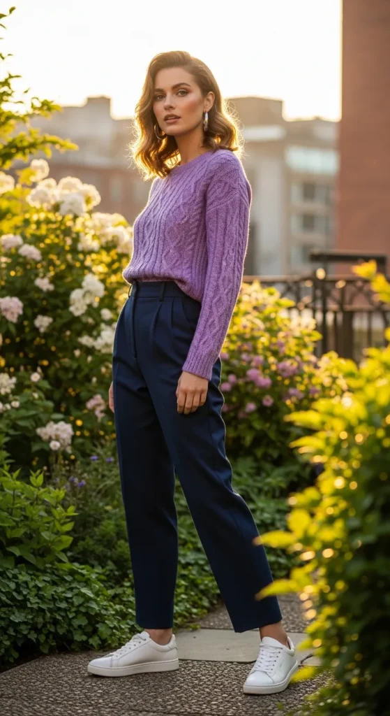 A pastel lilac sweater with navy pants introduces softness to structured tailoring. Perfect for spring outings or casual office settings where subtle color is welcomed.