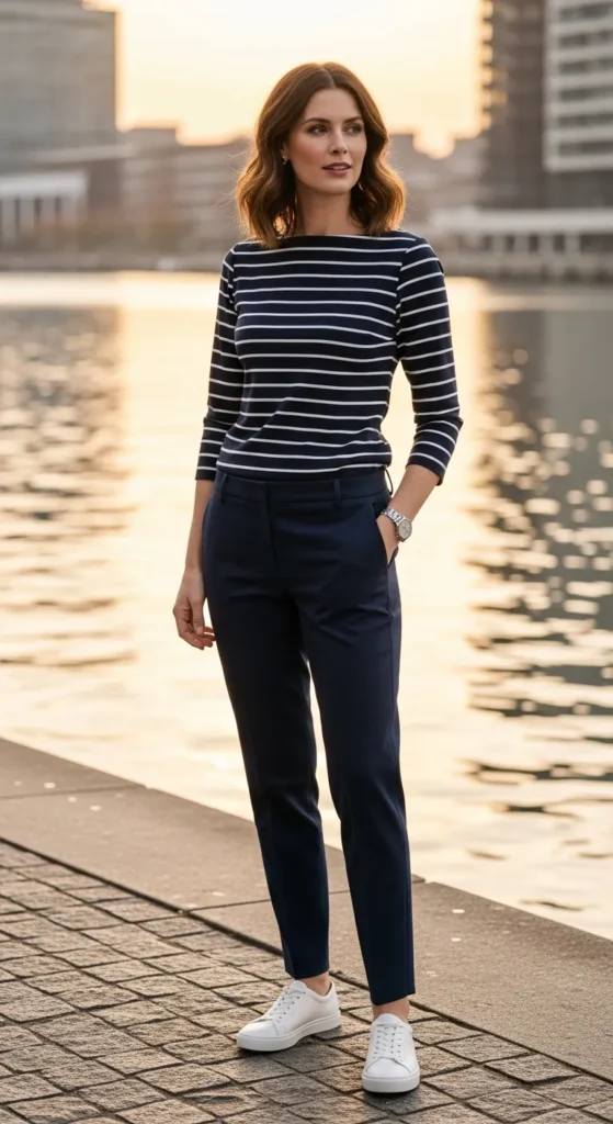 A classic navy-and-white striped boatneck top elevates navy pants for a nautical-inspired, polished outfit. It’s playful yet sophisticated, perfect for casual Fridays or art gallery visits.