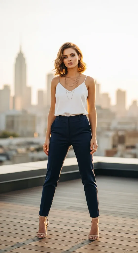 A white silk camisole tucked into navy trousers creates a polished yet relaxed evening look. Ideal for dinner dates or social gatherings where elegance is key.
