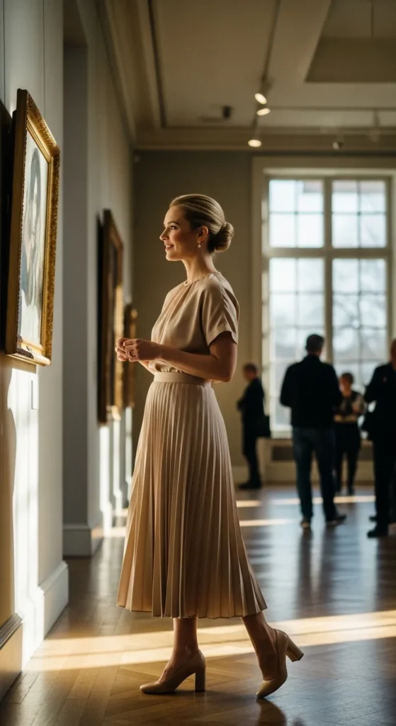 A beige pleated skirt paired with a short-sleeve blouse feels graceful and wearable. It’s an outfit that transitions easily from daytime plans to early evening dinners.