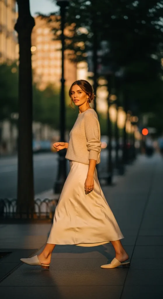 A silky beige slip skirt paired with a lightweight sweater feels soft and intentional. It’s perfect for evenings when the temperature drops but style still matters.