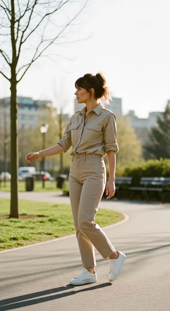 A beige utility style shirt paired with straight leg pants gives a casual, grounded vibe that still looks intentional. It’s practical, modern, and perfect for active summer days.