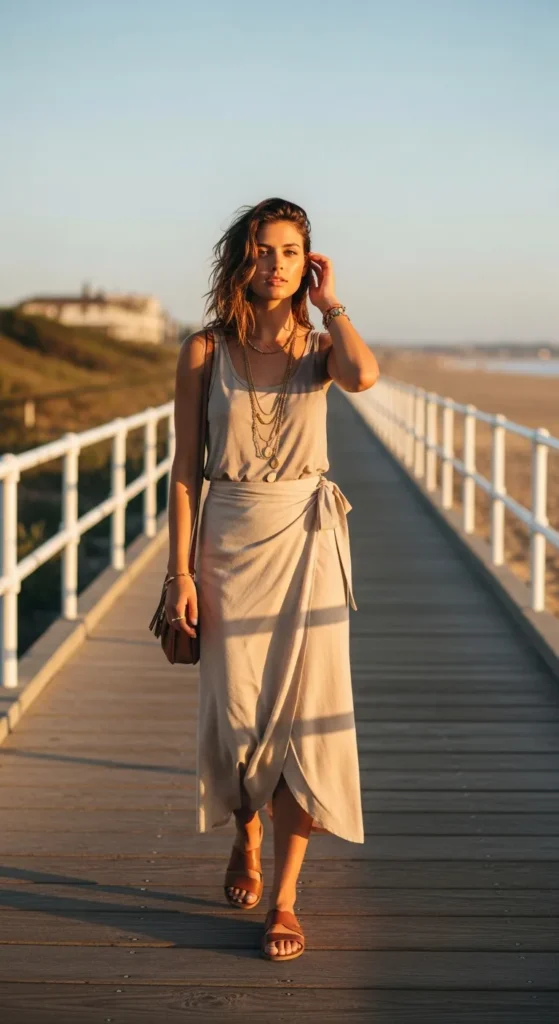 A beige wrap skirt paired with a simple neutral tank feels breezy and feminine. The wrap detail adds movement, making the outfit feel alive and playful without being overly styled.
