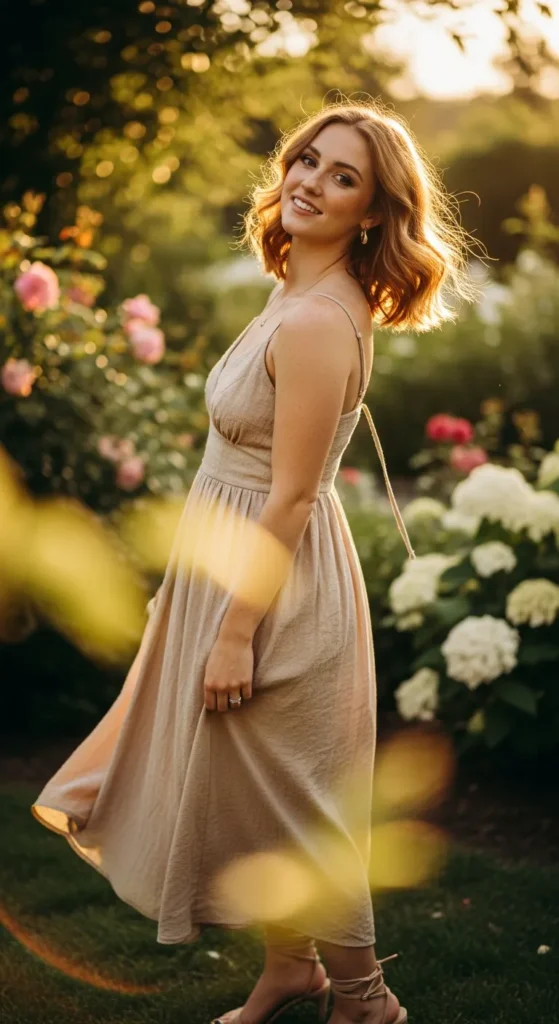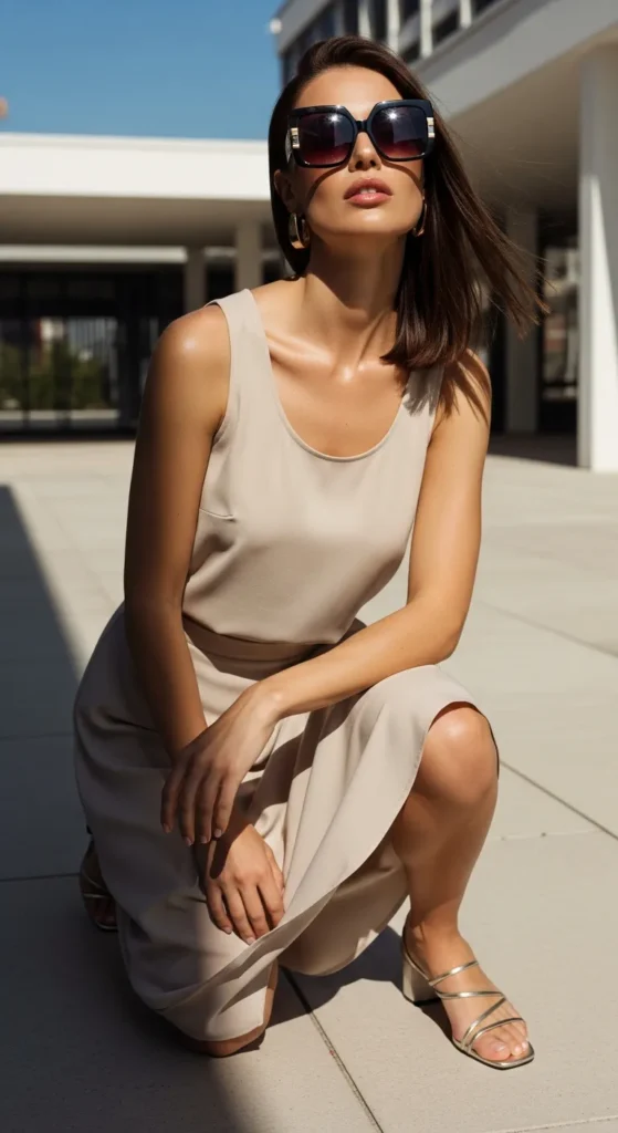 A textured beige midi dress drapes softly against the body, catching light with every step. It feels romantic without trying too hard, making it ideal for warm days when comfort and femininity matter equally.