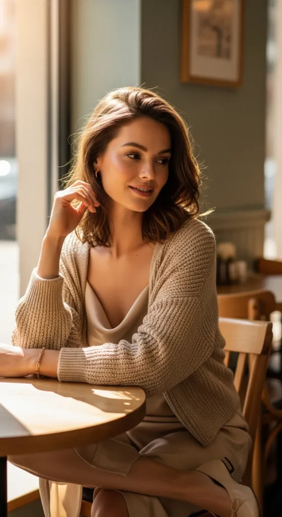 Layering a soft beige cardigan over a neutral slip dress creates a cozy yet summer appropriate outfit. It feels intimate and calm, perfect for mornings that start cool and warm up slowly.