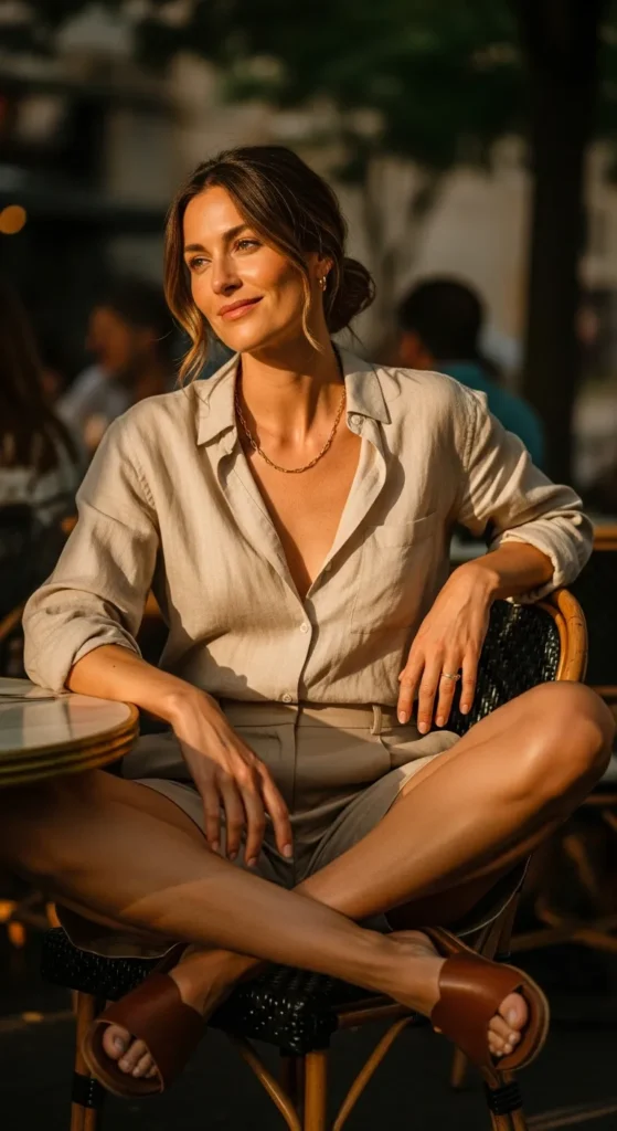 A lightweight beige linen button-down tucked loosely into tailored beige shorts feels airy and composed. It’s the kind of outfit that moves beautifully with summer heat while keeping your look intentionally simple and chic.