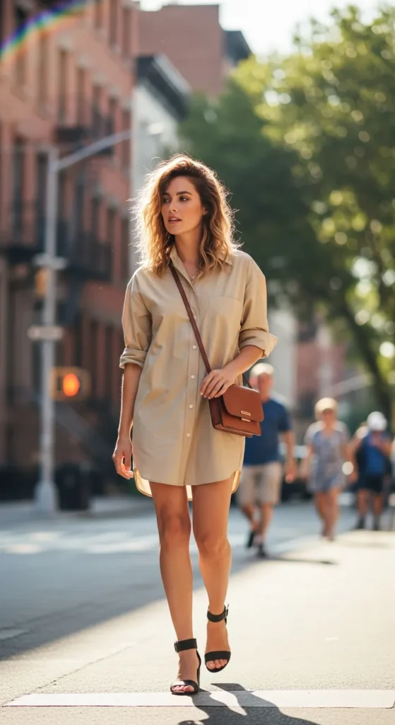 An oversized beige shirt worn as a dress feels effortless and confident. It’s casual yet stylish, ideal for hot days when you want minimal effort with maximum comfort.