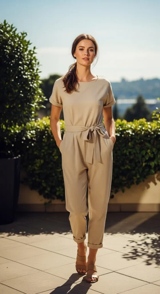 A relaxed beige jumpsuit offers an easy one-piece solution for summer. With a gently defined waist, it flatters without feeling restrictive or heavy.