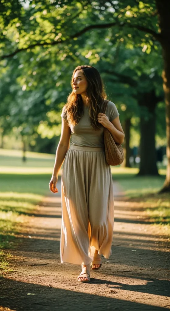 A flowing beige maxi skirt paired with a fitted neutral tee creates a comfortable yet feminine balance. It feels grounded, wearable, and perfect for everyday summer movement.