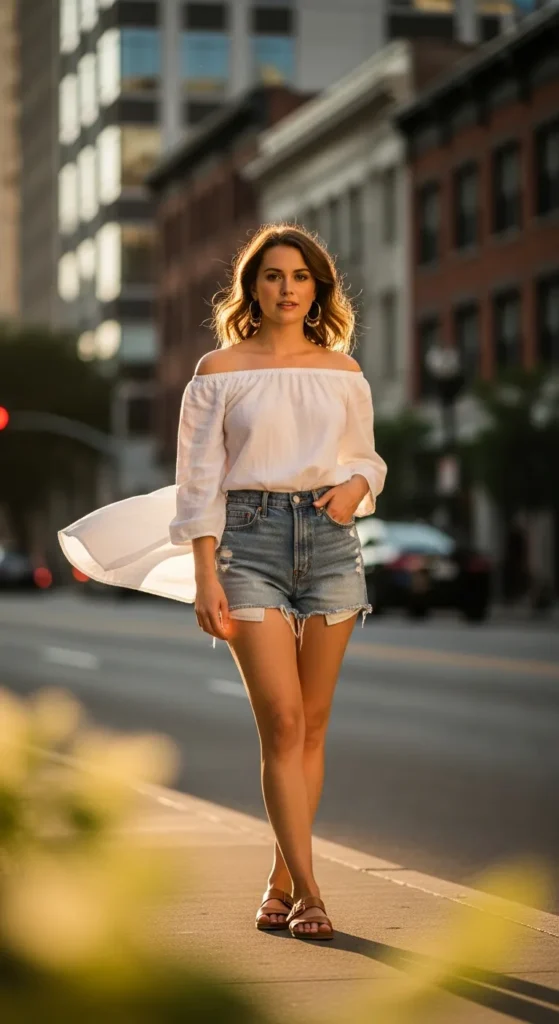 A crisp white linen off shoulder top tucked into faded high-waisted denim shorts creates a relaxed, sun-kissed look. Lightweight and airy, it’s ideal for summer days out with friends or casual strolls in the city.