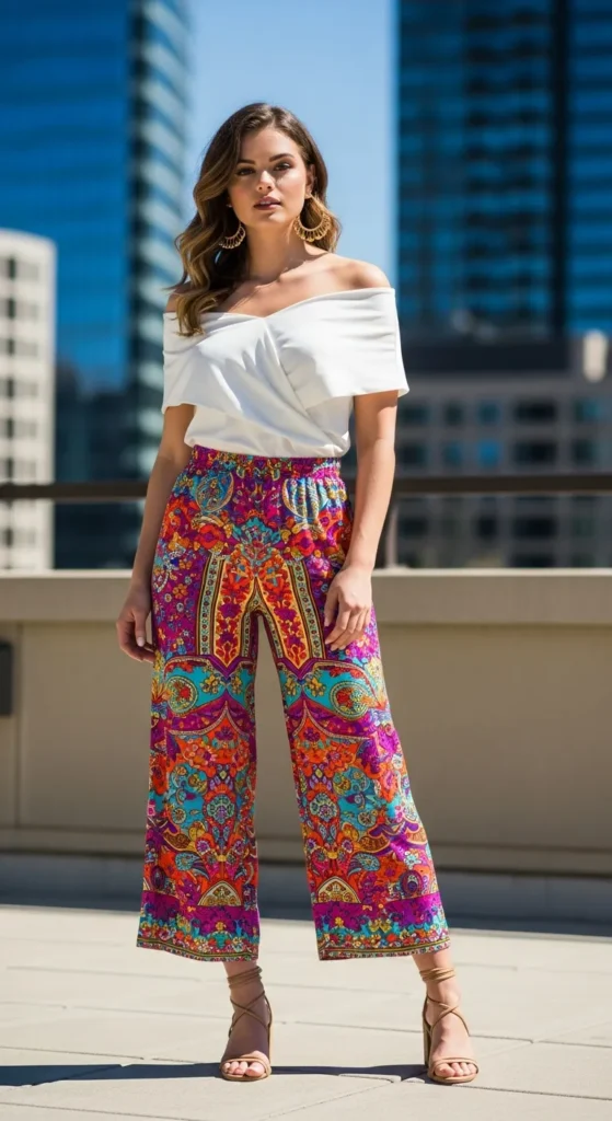 A simple solid off shoulder top paired with printed palazzo pants makes a bold yet balanced summer outfit. Perfect for brunch or casual meetups.