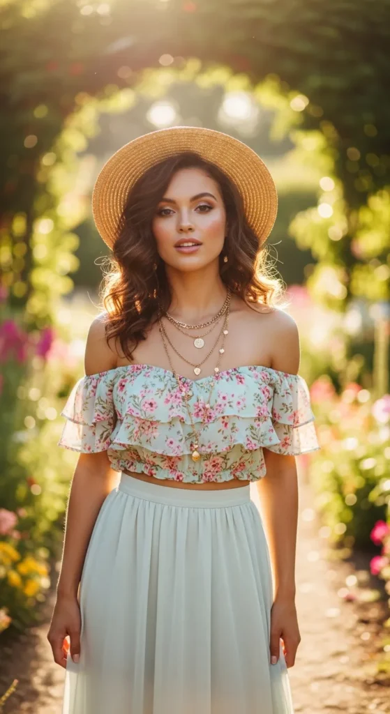 A puff-sleeved off shoulder top paired with a wrap midi skirt creates a whimsical summer vibe, perfect for brunch or garden events.