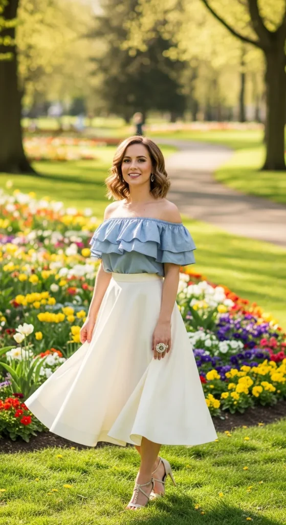 A lightweight ruffled off shoulder top tucked into a high-waisted A-line skirt adds feminine flair. The ruffles provide movement and charm while keeping the outfit breezy and chic.