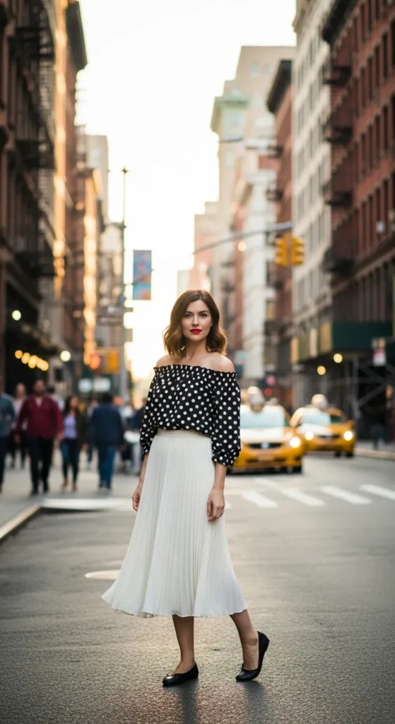 A black and white polka dot off shoulder top paired with a midi pleated skirt creates retro-inspired elegance. The airy pleats keep it comfortable and summer-ready.
