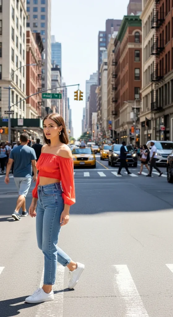A vibrant off shoulder crop top with high-waisted mom jeans delivers an effortless, youthful vibe. Ideal for weekend outings, coffee dates, or casual evening walks.