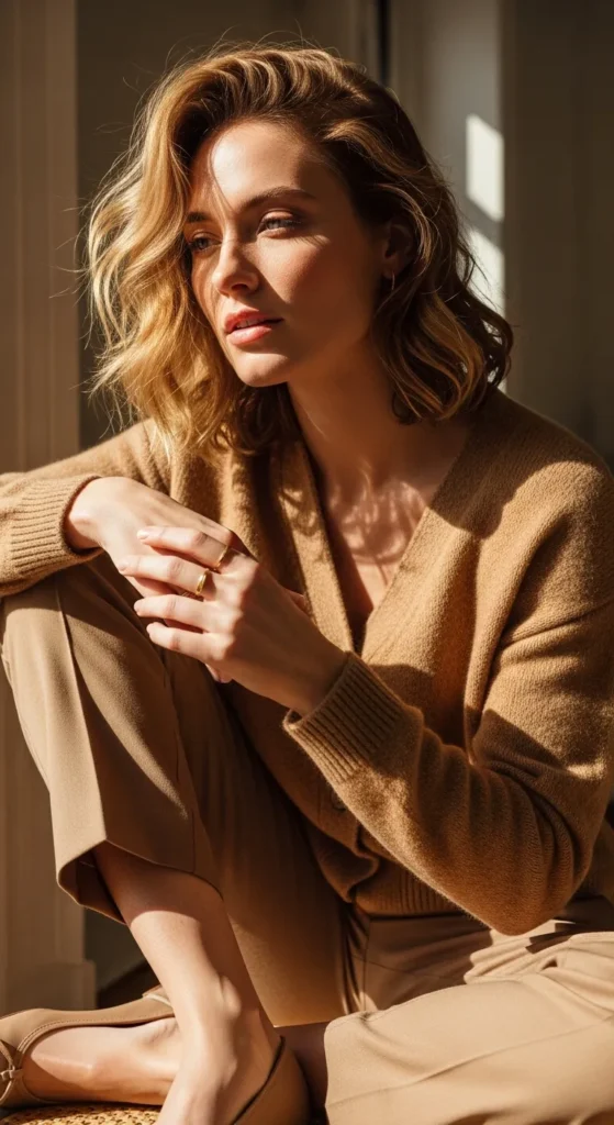 A monochrome camel outfit instantly feels expensive and calm. A fine-knit cardigan paired with matching trousers creates a cohesive look that feels intentional, warm, and quietly luxurious.