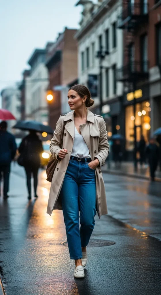 A timeless trench coat layered over straight-leg denim and a simple top feels effortlessly polished. It’s the kind of outfit that always looks right, no matter the season or setting.