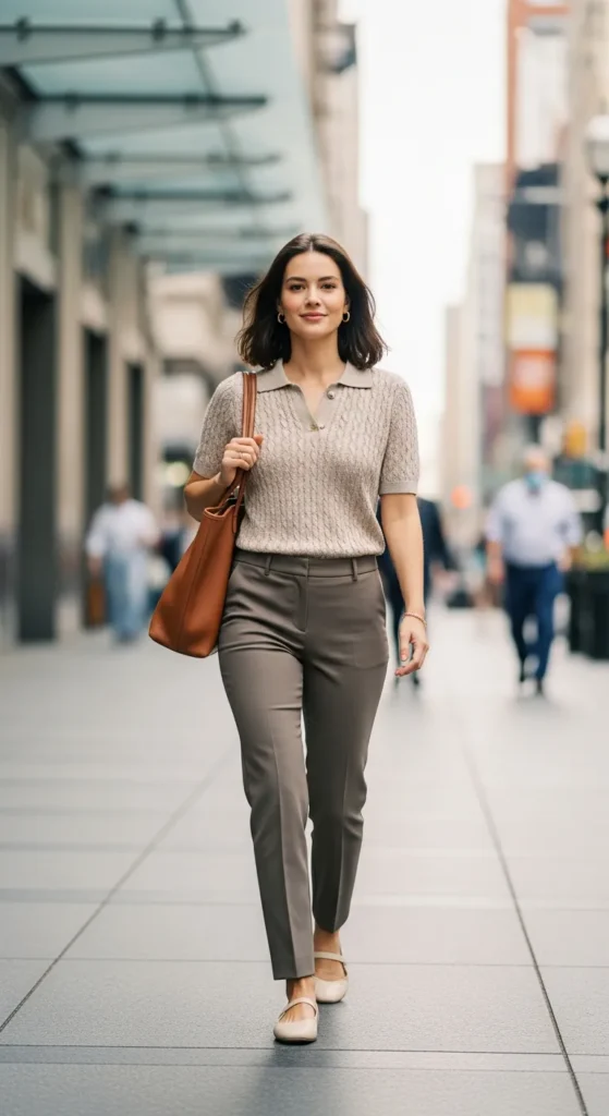 A fine knit polo paired with straight trousers feels understated and polished. It’s clean, classic, and quietly confident, perfect for everyday elegance without trying too hard.