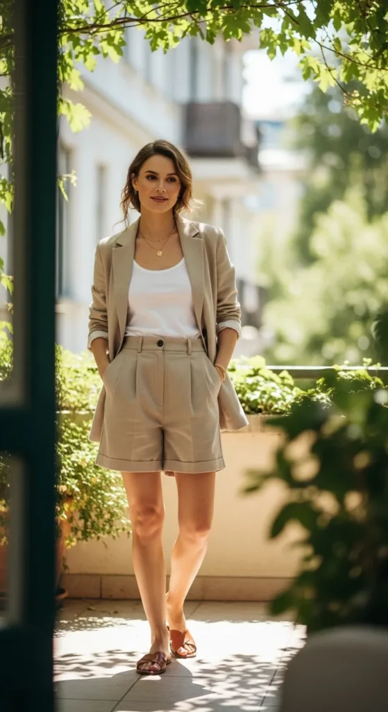 A linen blazer paired with tailored shorts feels fresh and elevated. It’s relaxed yet polished, ideal for warmer days when you still want structure without feeling overdressed.