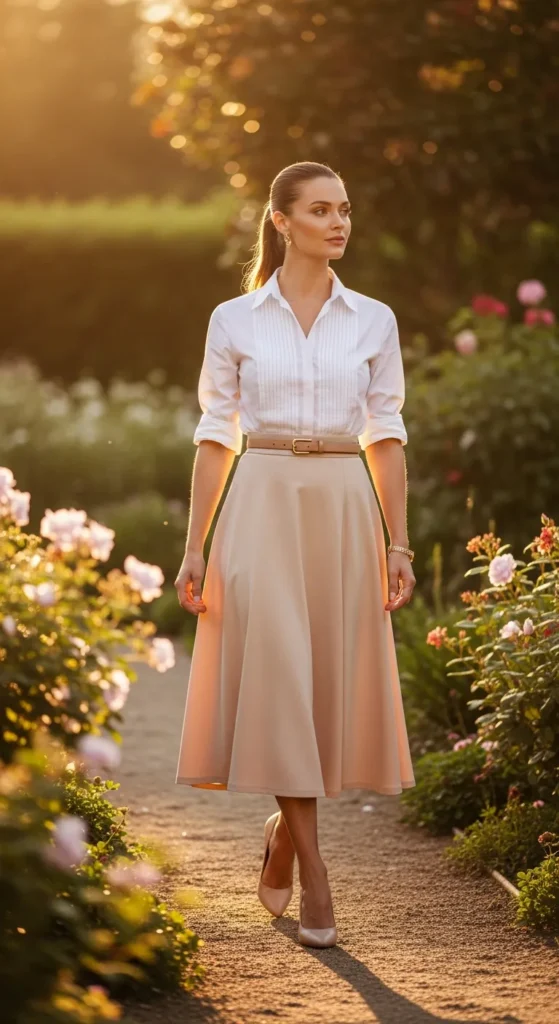 A fluid midi skirt paired with a crisp cotton shirt feels elegant without effort. The movement of the skirt adds softness, while the shirt keeps everything grounded and timeless.